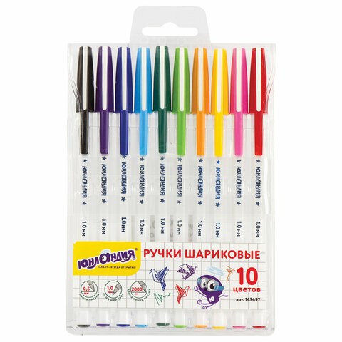 Ручки шариковые ЮНЛАНДИЯ "РАДУГА", НАБОР 10 цветов, длина письма 2000 м, узел 1 мм, линия письма 0,5