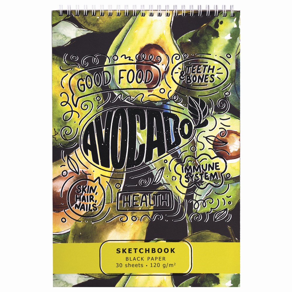 Скетчбук, черная бумага 120 г/м2, 195х300 мм, 30 л., гребень, SoftTouch, выборочный лак, "Авокадо", 97644