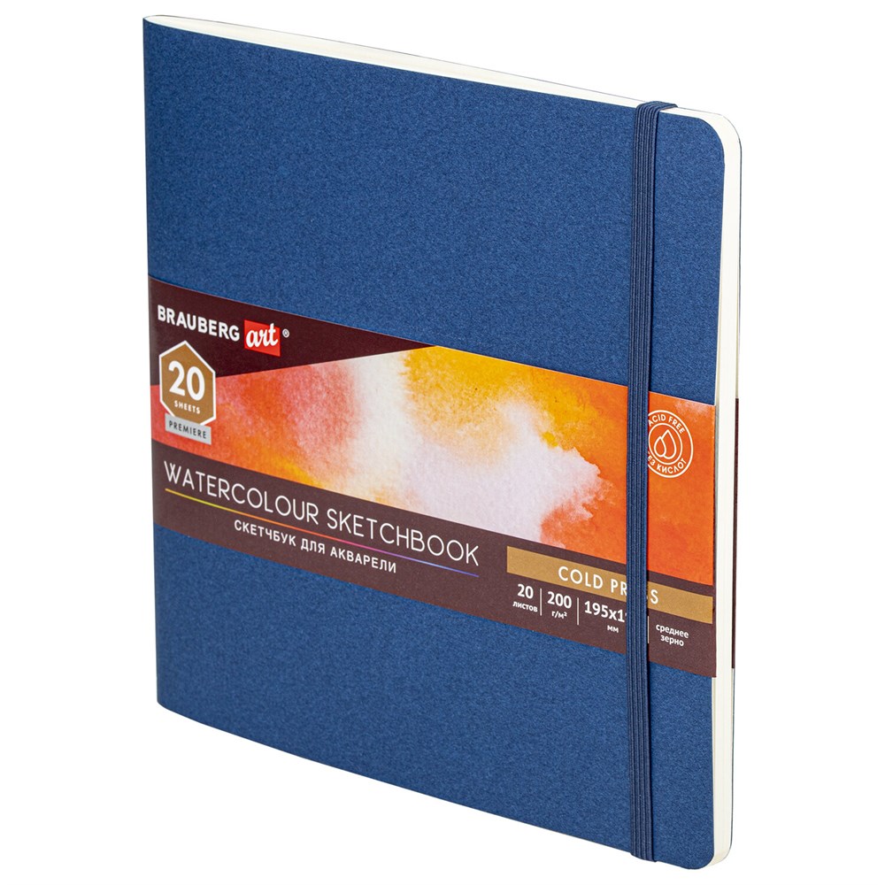 Скетчбук для акварели, 200 г/м2, 195х195 мм, среднее зерно, 20 л., сшивка, резинка, СИНИЙ, BRAUBERG ART PREMIERE, 113259