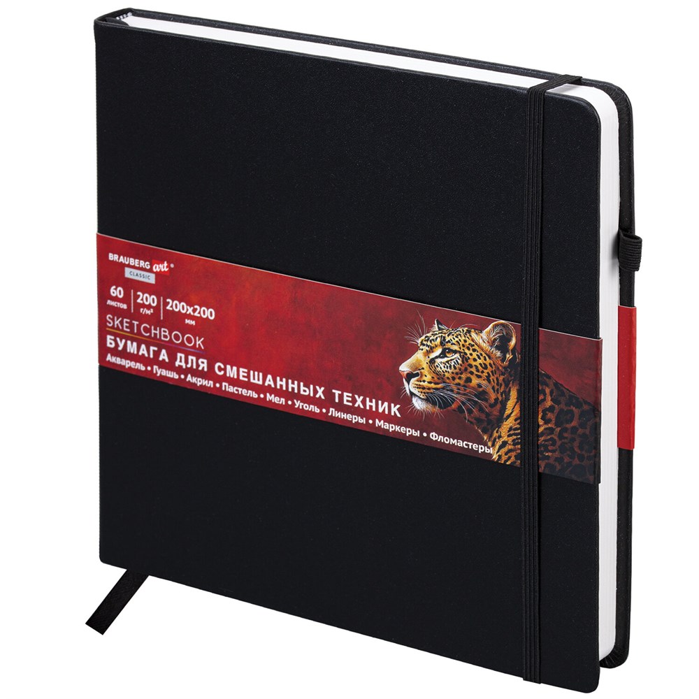 Скетчбук для смешанных техник MixMedia, 200 г/м2, 200х200 мм, 60 л., КОЖЗАМ, резинка, BRAUBERG ART CLASSIC, 116970