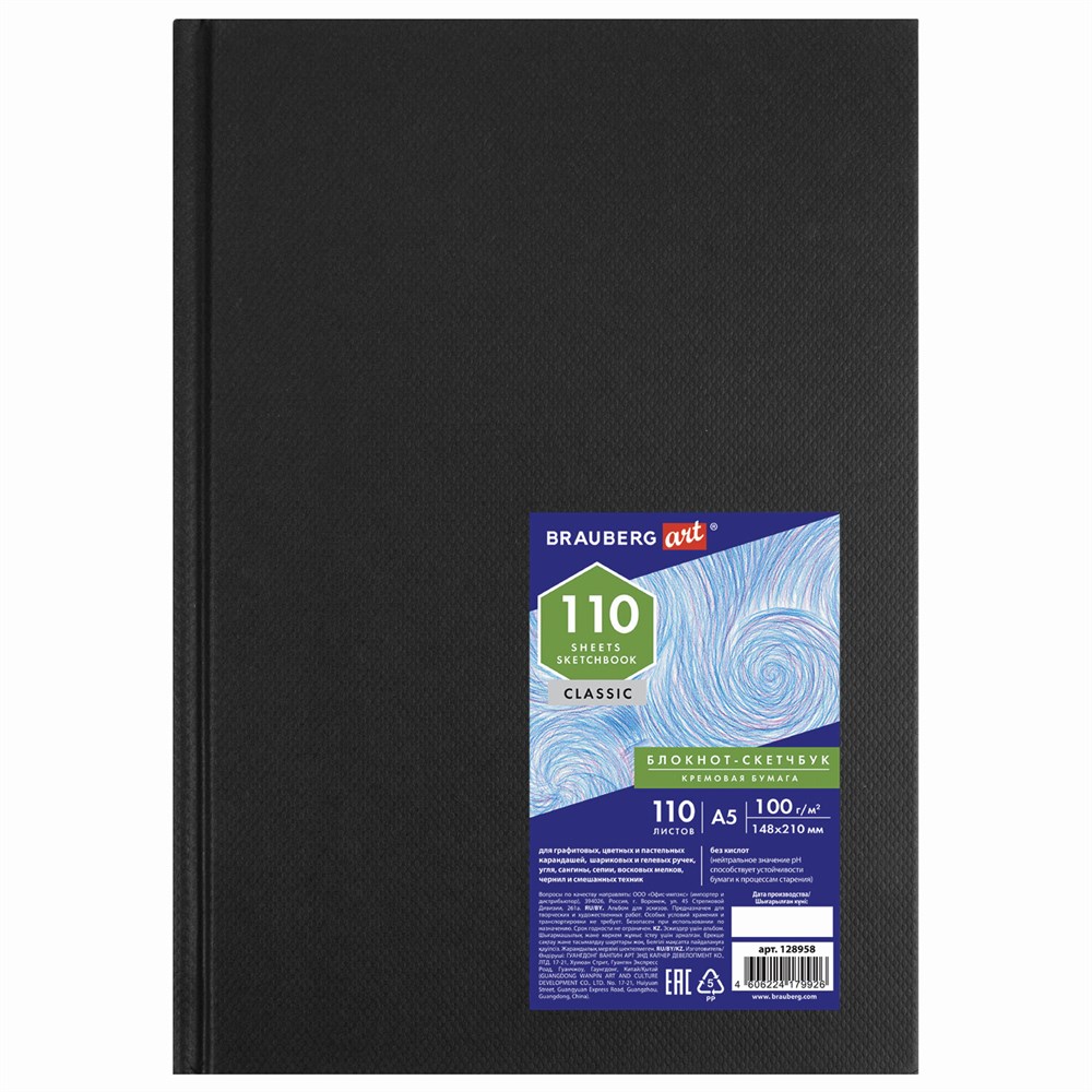 Скетчбук, слоновая кость 100 г/м2, 148х210 мм, 110 л., книжный твердый переплет, BRAUBERG ART CLASSIC, 128958