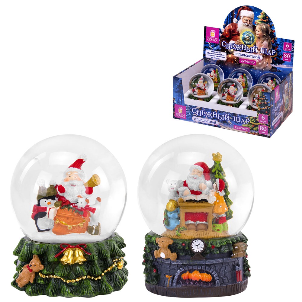Снежный шар "ЗОЛОТАЯ СКАЗКА" – это идеальный рождественский и новогодний подарок! Одно движение руки – и персонажи внутри шара как будто оживают, попадают в снежную зимнюю сказку.Сувенир представляет собой стеклянный шар, в котором находится фигурка зимнего персонажа и светодиод, работающий от двух кнопочных батареек "таблеток" типа LR44 (в комплект не входят). Блок для батареек находится в нижней части подставки, выполненной в виде уютного камина и нарядной елки. Стоит только встряхнуть этот чудесный снежный шар, и вы окунетесь в мир новогодних чудес.