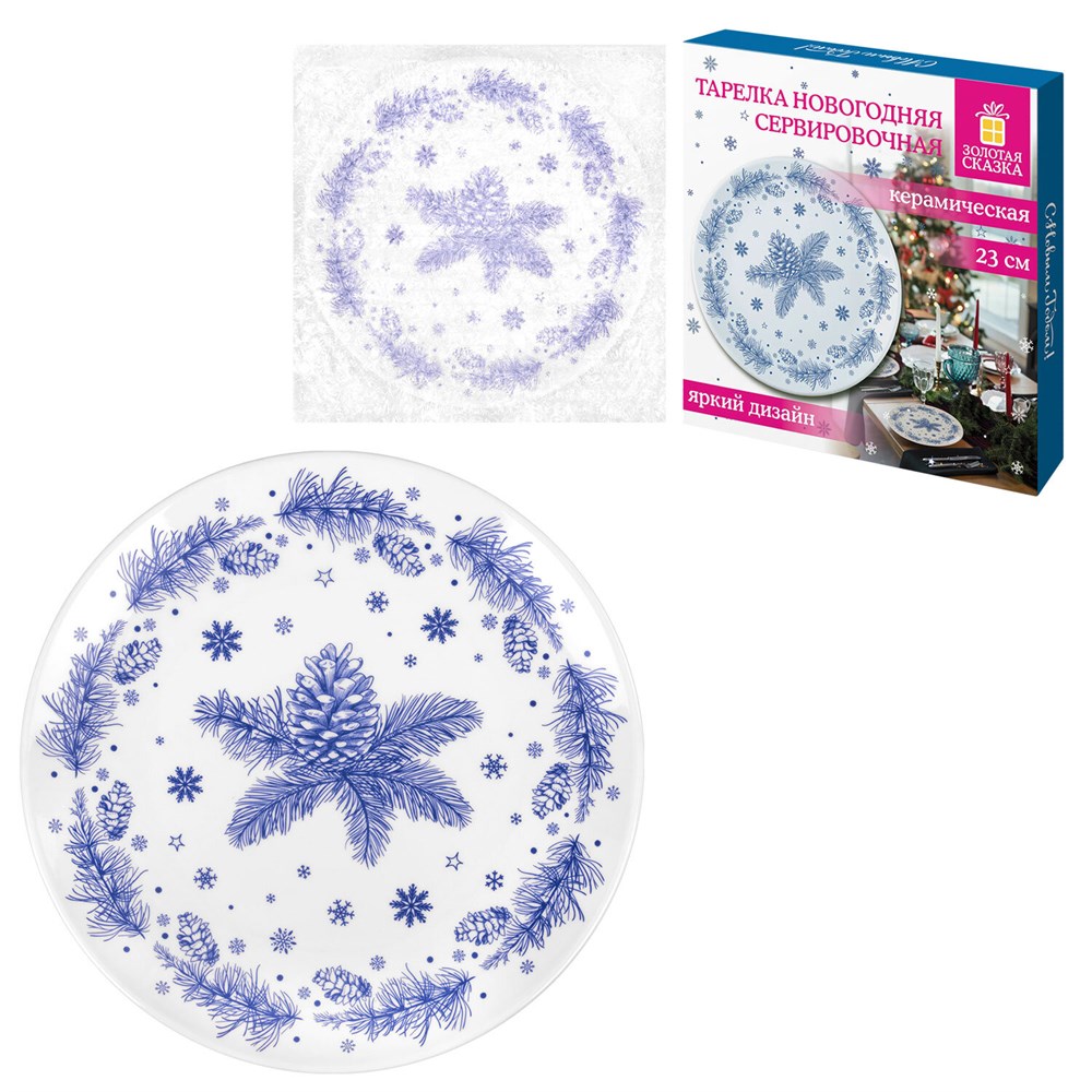 Тарелка сервировочная новогодняя 23 см, "Еловые ветки", каменная керамика, ЗОЛОТАЯ СКАЗКА, 592548