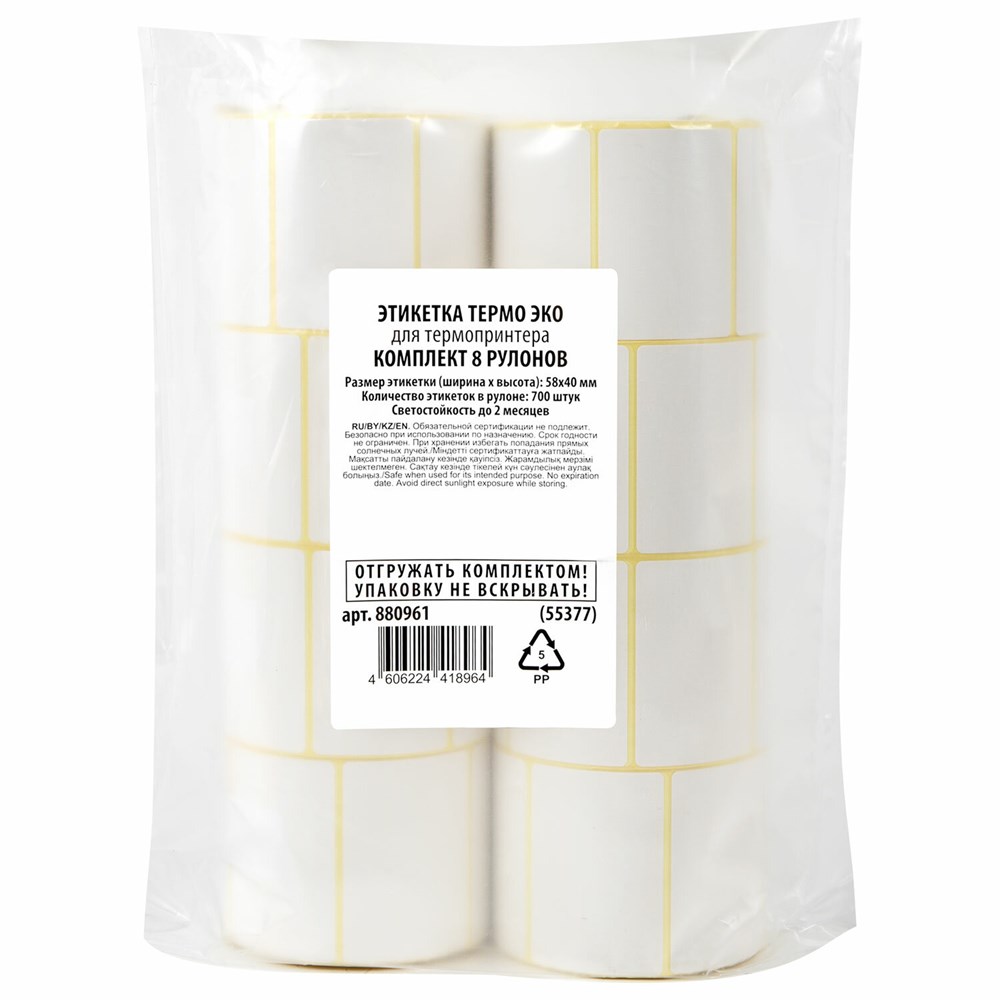 Термоэтикетки ЭКО, 58х40 мм, КОМПЛЕКТ 8 рулонов по 700 этикеток, 880961
