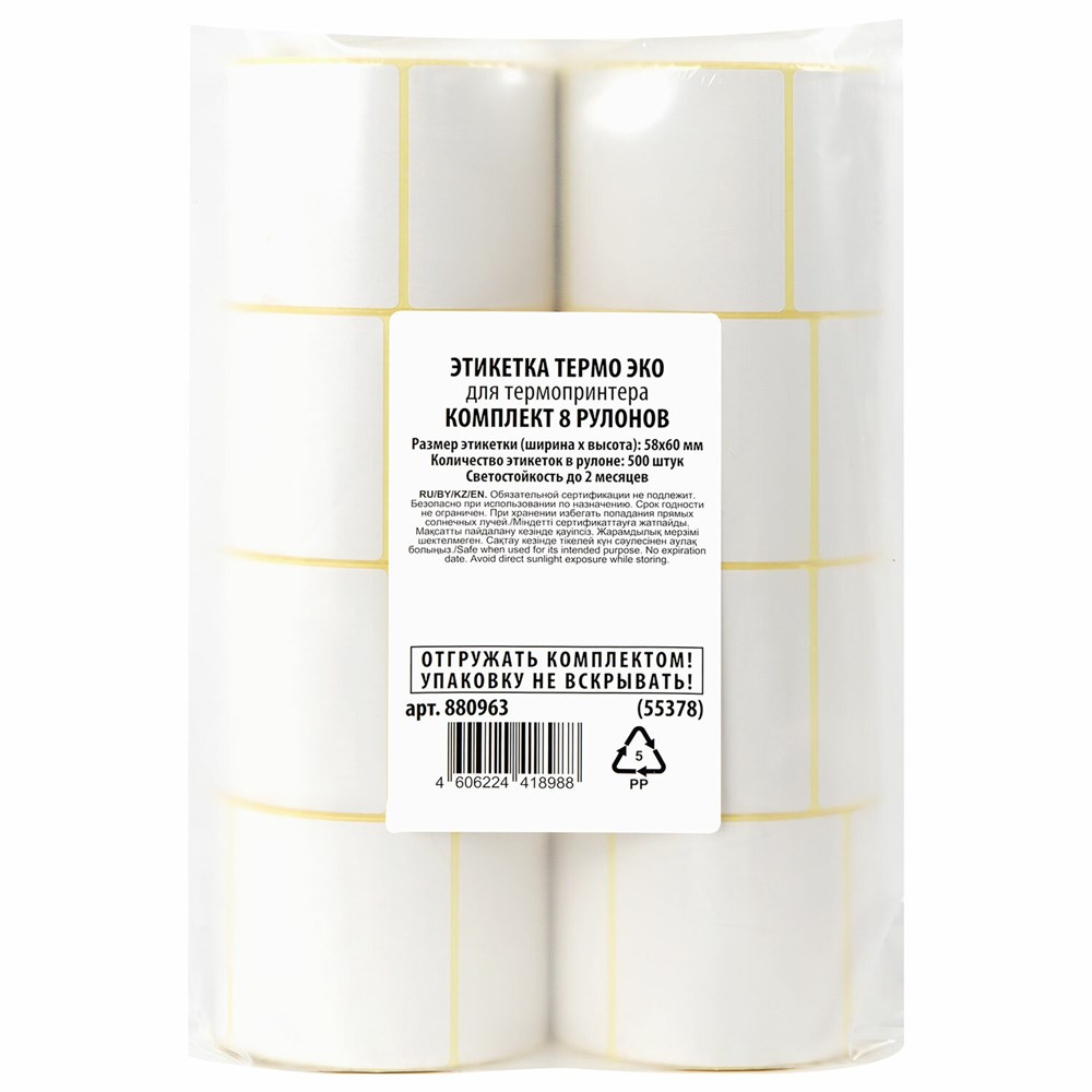 Термоэтикетки ЭКО, 58х60 мм, КОМПЛЕКТ 8 рулонов по 500 этикеток, 880963