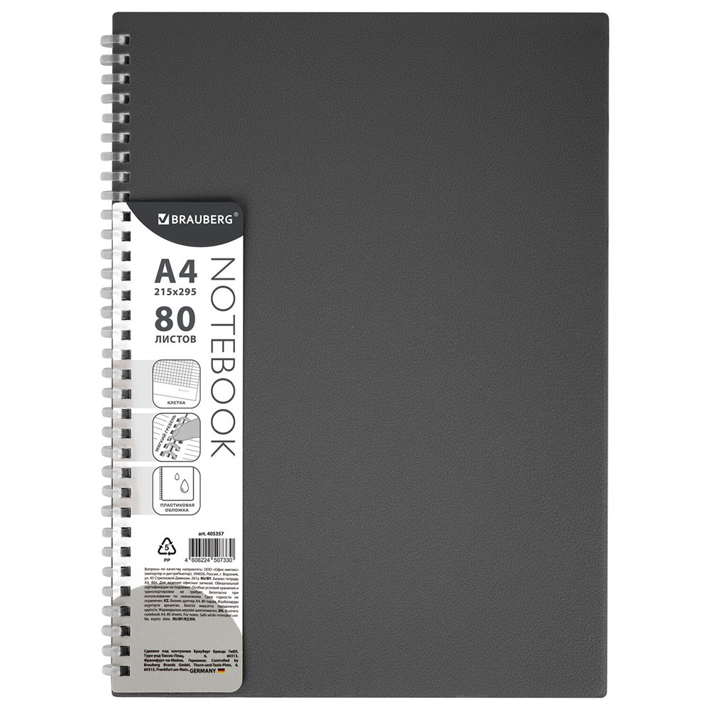 Тетрадь обложка пластик, А4 80 л., гребень мягкий (силиконовый), клетка, BRAUBERG, серый, 405357