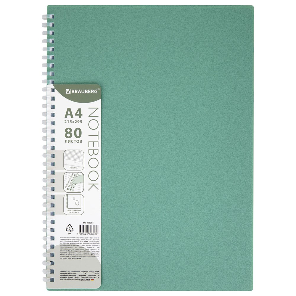 Тетрадь обложка пластик, А4 80 л., гребень мягкий (силиконовый), клетка, BRAUBERG, зеленая, 405355