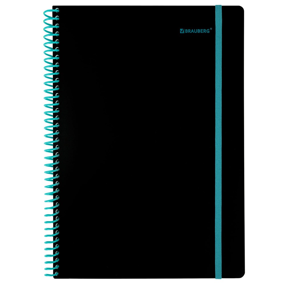 Тетрадь обложка пластик, А4 80 л., спираль пластик, резинка, клетка, BRAUBERG, черный/синий, 405381