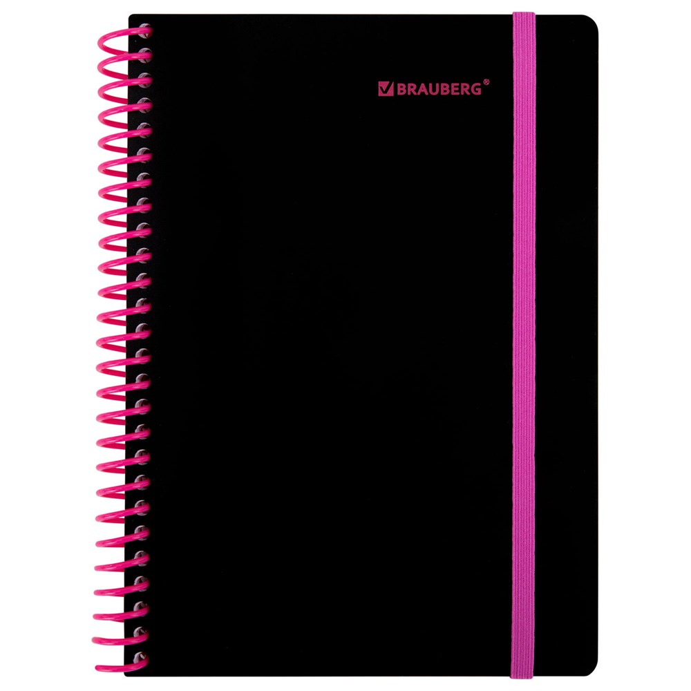 Тетрадь обложка пластик, А5 80 л., спираль пластик, резинка, клетка, BRAUBERG, черный/розовый, 405384