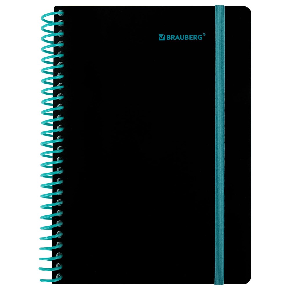 Тетрадь обложка пластик, А5 80 л., спираль пластик, резинка, клетка, BRAUBERG, черный/синий, 405385