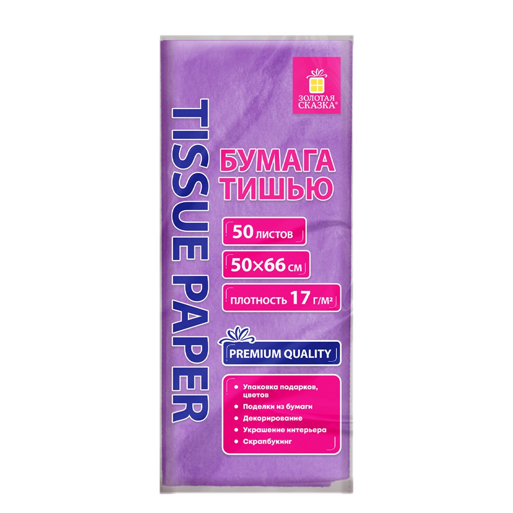 Цветная бумага ТИШЬЮ 17г/м2, 50х66см, 50 листов пастель сиреневый, ЗОЛОТАЯ СКАЗКА, 116488