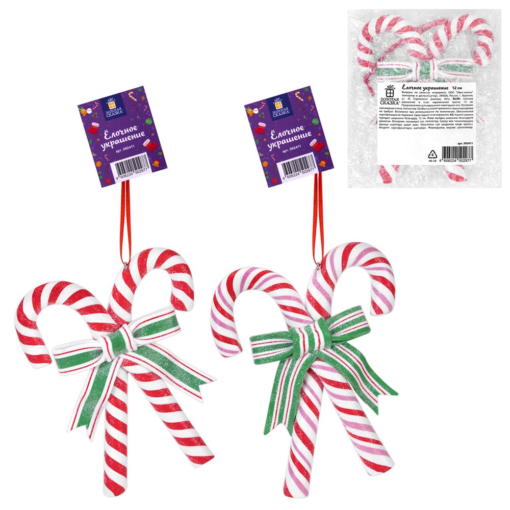 Украшение елочное (1 шт.) "Карамельная трость" 12х10 см, полимерная глина, ассорти 2 дизайна, ЗОЛОТАЯ СКАЗКА, 592411