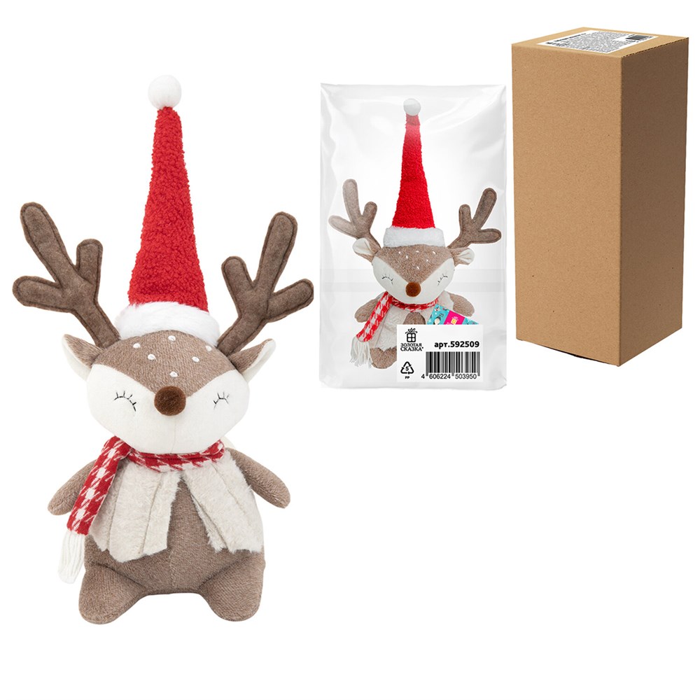 Олененок упакован в пакет с клейким краем и в гофрокороб. Материал – полиэстер, дерево. Размер – 40 см.