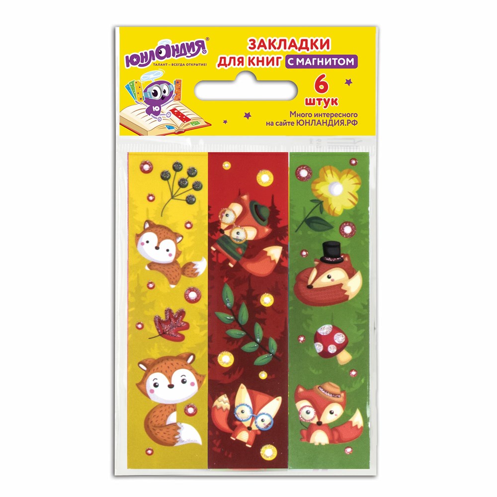 Закладки для книг с магнитом "ЛИСЯТА", набор 6 шт., блестки, 25x196 мм, ЮНЛАНДИЯ, 111639