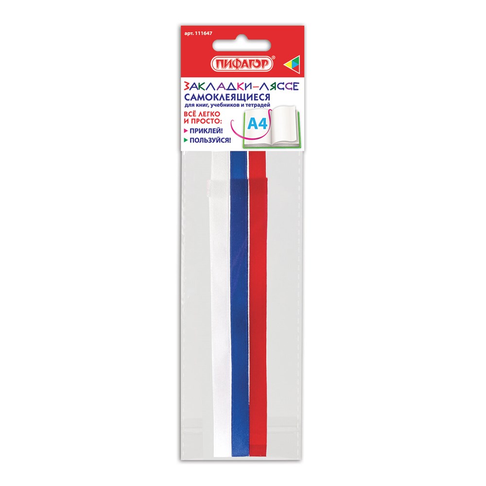 Закладки-ляссе "ТРИКОЛОР" для книг А4 (длина 38 см) ПИФАГОР, клейкий край, 3 ленты, 111647
